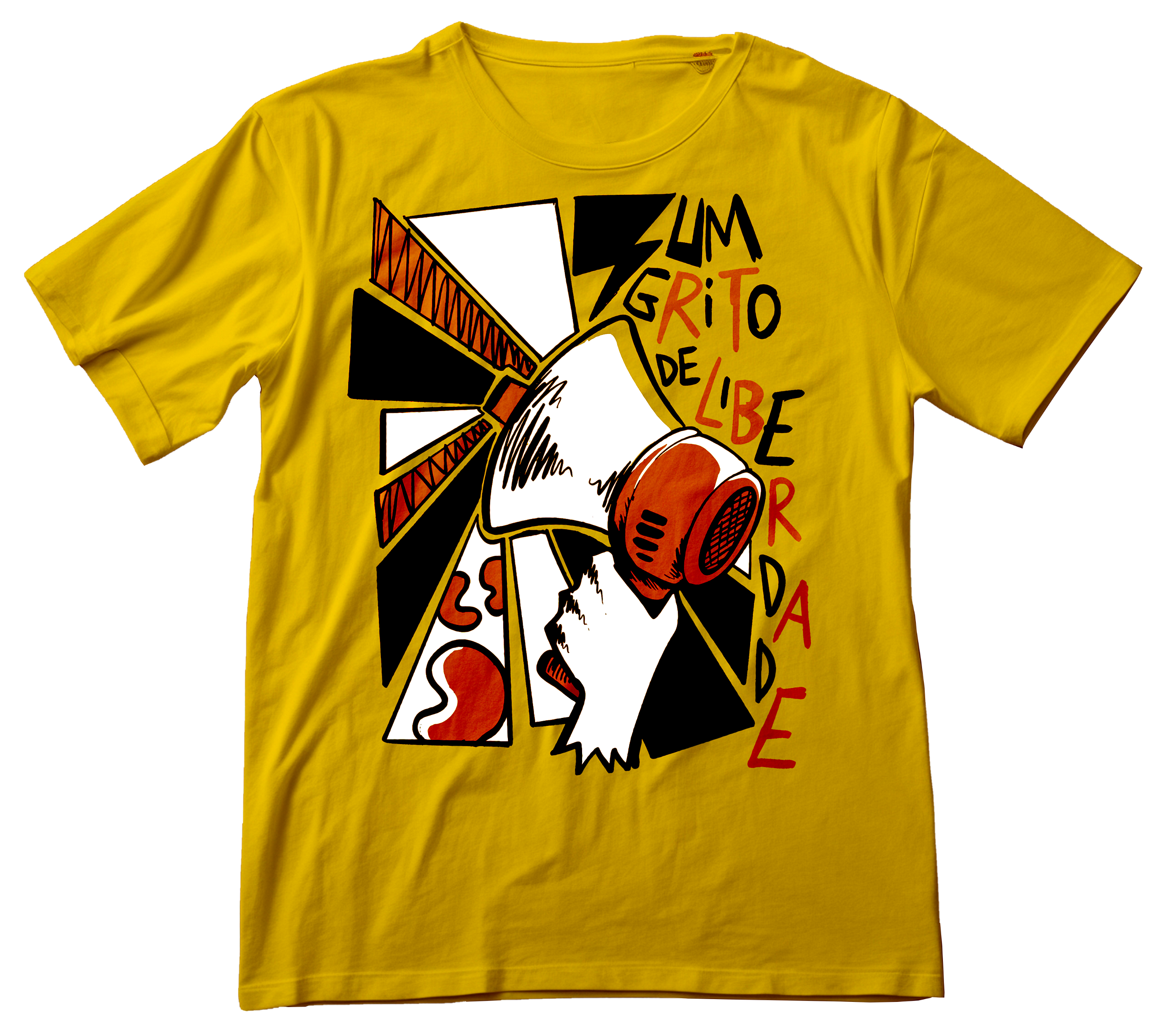 Camiseta mostarda com estampa autoral, contém a frase "Um Grito de Liberdade"