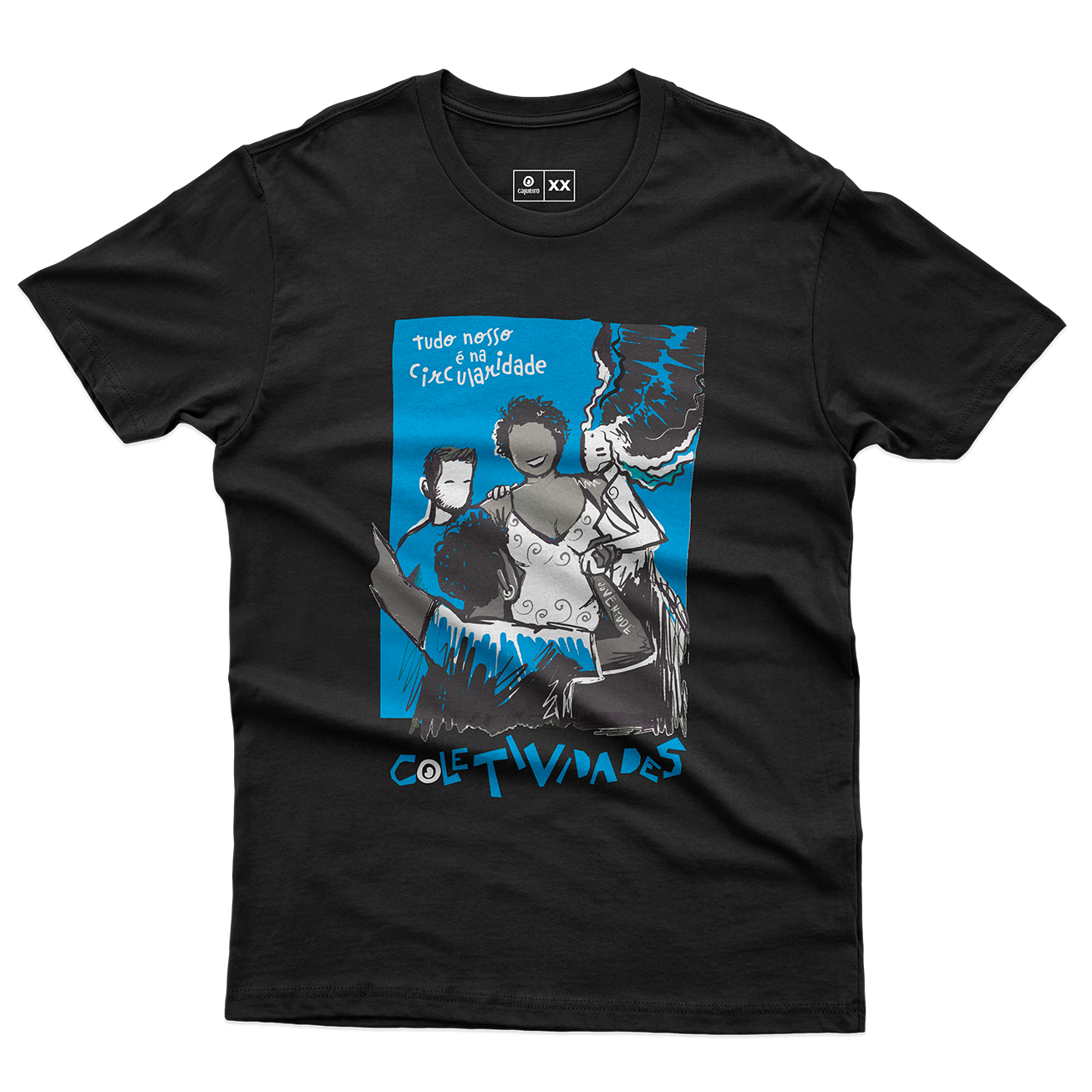 Camiseta com a estampa "TUDO NOSSO É NA CIRCULARIDADE/COLETIVIDADES". Garanta já a sua!